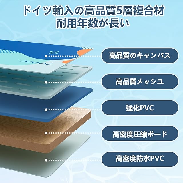 【耐久性試験に合格】引張強度が530PSIに達しています。7mm厚さの5層複合ビニール素材に高品質ポリエステルメッシュを採用しております。業界標準の単層ビニール製プールとは次元が違っています。厳しい材料疲労試験では12,000回以上の繰り返し応力に耐え、市販折りたたみプール素材の3倍の耐久性を確認しました。そのため、季節を問わず永くご使用いただけます。●高品質の厚手素材を採用しているため、やや重くなり、ご注意ください(2.1mタイプ:12.7kg/2.6mタイプ:16.70kg/3mタイプ:18.3kg)。