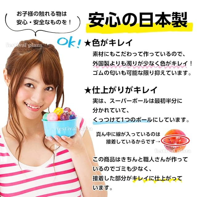 ご利用のモニターやパソコン環境によっては、<br>色の見え方に差異が生じる場合がございます。予めご了承ください。<br><br>屋内ですと、くすんで見える場合がございます。<br>ストロボや、太陽光のもとでは透明度や光沢があるように見えます。<br><br>国産スーパーボールを使用!<br>日本の職人の技が生み出す、安全、しかもとっても色どり鮮やか、華やかさと楽しさが自慢の商品です♪<br><br>コストパフォーマンスにとても優れていますのでこの機会にぜひご利用下さい!<br><br>【セット内容】<br>18mm…960個<br>27mm…30個<br>32mm…5個<br>38mm…3個<br>45mm…2個<br><br>日本製<br><br>※ご注文の前に必ずお読み下さい<br>こちらの商品は予告なく仕様等の変更がある場合がございます。ご了承の上お買い求め下さい。