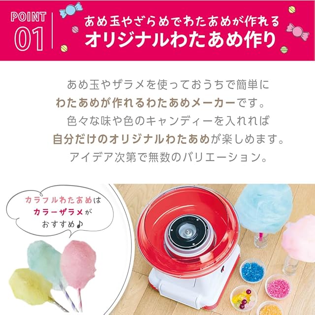 ✅あめ玉やザラメを使って簡単にわたあめが作れるわたあめメーカー:いろいろな味のキャンディーで手軽にオリジナルわたあめ作り色々な味や色のキャンディーを入れれば自分だけのオリジナルわたあめが楽しめます。本格的な大きいわたあめを作りたい場合はザラメがおすすめ。