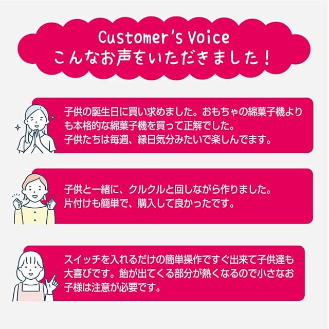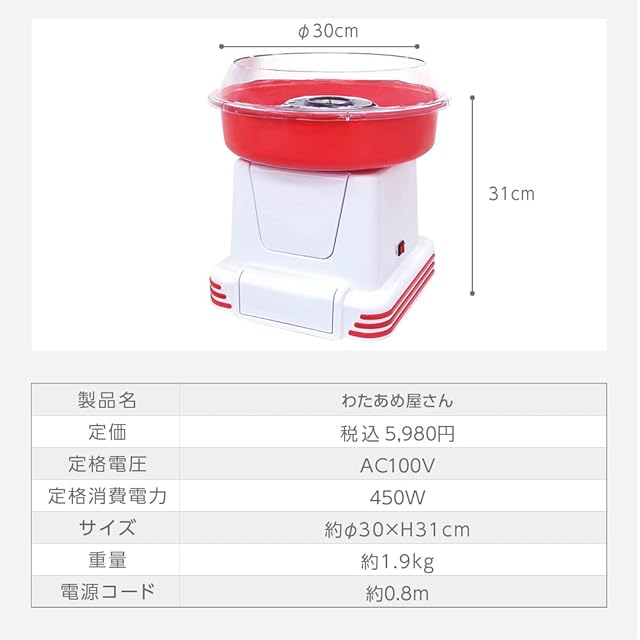商品の特徴<br>✅あめ玉やザラメを使って簡単にわたあめが作れるわたあめメーカー<br>いろいろな味のキャンディーで手軽にオリジナルわたあめ作り<br>色々な味や色のキャンディーを入れれば自分だけのオリジナルわたあめが楽しめます。<br>本格的な大きいわたあめを作りたい場合はザラメがおすすめ。<br>アイデア次第で無数のバリエーション。<br>✅みんなで楽しく盛り上がれる<br>みんなで作れば楽しさも倍増です。<br>ホームパーティーなど人が集まる場面での盛り上げアイテムに!<br>✅コンパクトながらパワフルなヒーター<br>加熱速度が速く、約2分であめができ始めます。<br>家庭用ながら本格的なヒーターがついています。お子様の大喜び間違いなし!<br><br>こんな方におすすめ!<br>〇ホームパーティーをされる方<br>〇おうち縁日をかんがえている方<br>〇クッキングトイでのギフトを考えている方<br><br>安心の1年<br>通常使用で1年以内に不具合が発生した場合、新しい商品と無料で交換させていただきます。<br>※ライソンストアでご購入の場合、書に印がございませんので注文時の購入履歴やリターンメールを書の代わりといたします。<br><br>お手入れについて<br>※危険ですので本体が冷めてから作業してください※<br>●本体<br>軽く湿らせた布などで拭いてください。水分が本体内に入らないようにご注意ください。<br>本体は水洗いできません。<br>●受け皿部分/回転皿<br>本体から取り外し、くっついたあめを台所用洗剤で洗ってよくすすぎ、乾かしてください。<br>※ぬるま湯で洗うと、あめが落ちやすくなります。