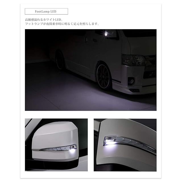 流れるウインカー、ウインカー非点灯時に点灯させることのできるオプションランプ機能、夜間乗車時に足元を照らすフットライト機能付