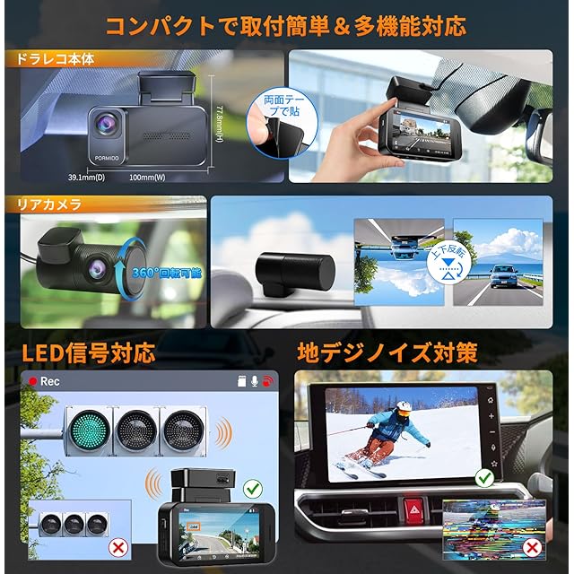 【コンパクト設計&簡単取付–多機能&日本仕様対応】前後カメラ 小型 コンパクト設計で素人でも簡単装着!◆本体サイズは100mm(W)×77.8mm(H)×39.1mm(D)のコンパクト設計で、視界を妨げずにスッキリ取付可能。◆リアカメラは上下・左右反転機能を搭載し、軽自動車からミニバンまで幅広く対応。◆Type-C電源ポートを採用し、安定した電力供給と高速データ転送を実現。◆高透過率フィルターを搭載し、スモークガラス装着車でもクリアな映像を記録可能!◆LED信号対策済み&地デジノイズ干渉防止機能も搭載。