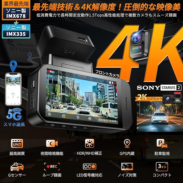 PORMIDO【業界最高峰 4K+2K 超高精細画質】ドライブレコーダー 前後カメラ【ソニー製830万画素IMX678 & 370万画素IMX335センサー搭載の小型ドラレコ】STARVIS 2+HDR/WDR 昼夜クリア録画【夜間無灯火・豪雨・逆光対応】5G WiFi&スマホ連携 GPS内蔵 Gセンサー 駐車監視 170°超広角 全国LED信号機/地デジノイズ対策 技適取得済み品 DT100