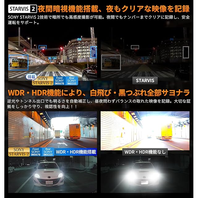 【STARVIS 2&WHD/HDR搭載–夜間や逆光でも鮮明録画】最新のSTARVIS2技術を採用し、従来モデルと比較して夜間映像の明瞭度が2倍向上!暗所でも細部までしっかり捉え、夜間走行時の安全性を大幅に向上。HDR/WDR補正機能により、逆光やトンネル内、ヘッドライトの強い光にも対応。さらに、【露出度調整機能】を搭載し、明るさに応じて最適な映像をリアルタイムで記録。夜間の無灯火道路や暗い駐車場でもナンバープレートや標識をはっきりと撮影可能!