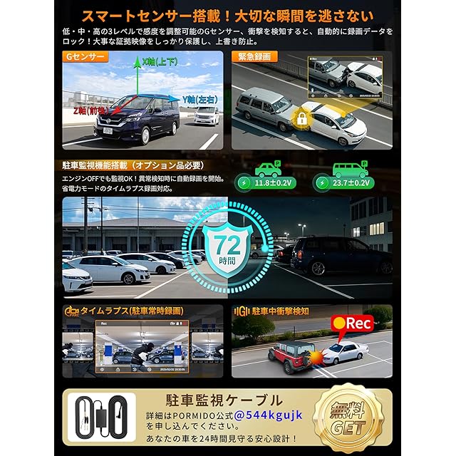 【Gセンサー&GPS内蔵–事故記録・走行ルート確認・駐車監視対応】◆【GPS内蔵】により、走行ルートや速度情報を記録し、専用ソフトで確認可能。万が一の事故やトラブル時に、正確な位置情報を証拠として提供。◆【駐車監視機能】にも対応し、衝撃を検知すると自動で録画を開始し、当て逃げや車上荒らしの決定的瞬間を記録。タイムラプス録画機能により、駐車中の状況を長時間監視でき、不審者の動きや周囲の変化を逃さず記録。エンジン停止後も愛車を24時間見守ることが可能!(※オプションの駐車監視ケーブルが必要)
