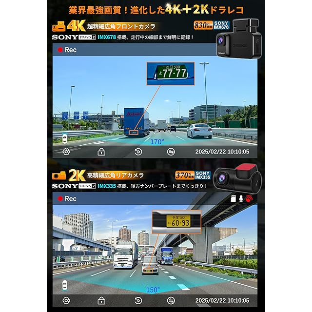 【4K+2K超高画質&前後同時録画–業界最高レベルの鮮明映像】最新のソニー製IMX678(フロント4K)&IMX335(リア2K)センサー搭載。ドラレコ 前後カメラモデルとして業界トップクラスの4K+2K超高精細画質を実現!標識やナンバープレートの細部までクリアに録画。事故やトラブル時の決定的瞬間を確実に記録し、証拠映像として最適!フロントカメラは対角170°、リアカメラは対角150°の超広角レンズで、死角を最小限に抑えた広範囲録画が可能。4k 小型ドライブレコーダーの中でも注目の2025年最新高性能モデル。