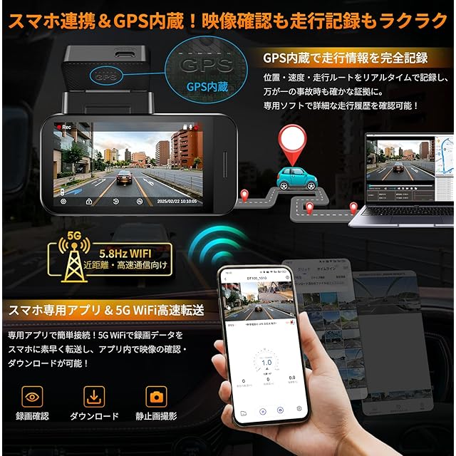 【5G WiFi&専用アプリ連携–スマホで映像をリアルタイム確認&転送】5G WiFiに対応し、スマホと瞬時に 接続のスマホ連携ドライブレコーダー!専用アプリ(iOS/Android)を使用して、ワンタップで録画映像をリアルタイム確認・保存。SDカード不要で、ワイヤレスで映像を管理可能。事故時には、その場で映像を保険会社に提出できるので、スムーズな手続きが可能に!さらに、家族や友人と映像をシェアするのも簡単!※PC側GPS再生ソフトのダウンロードリング:https://pormido.co.jp/pages/player