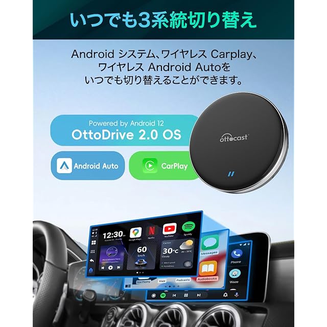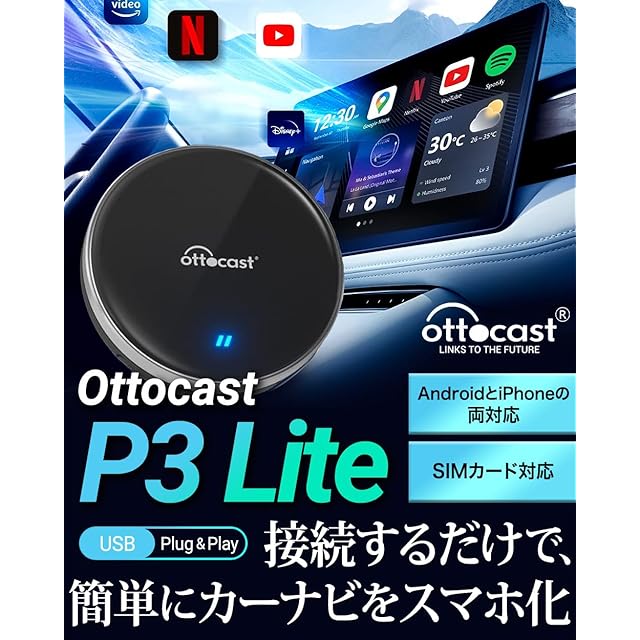 【国内正規代理店】オットキャスト P3 Lite OTTOCAST P3 Lite carplay ai box カープレイドングル 有線接続のみの純正CarPlayをワイヤレス化 無線化 android 12.0モデル ワイヤレス CarPlay Android Auto両対応 動画視聴可能 クリーニングクロス付き