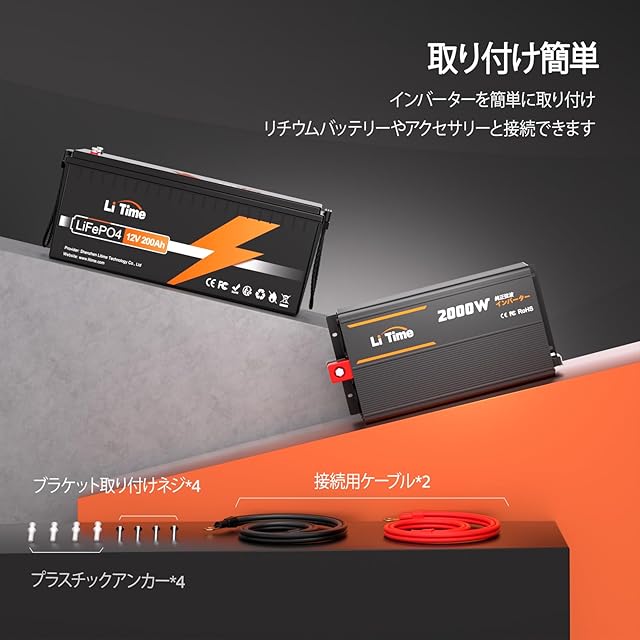 【便利に使用可能のための豊富な付属品】LiTime 12V2KW インバーターのパッケージには、インバーター本体以外に、リモートコントロールモジュール×1、リモートコントロールケーブル×1、バッテリーと接続用ケーブル×2、アースケーブル×1、取付用のネジやプラスチックアンカー等が付属されています。お手元に届きましたら、すぐに使用開始できます。インバーター本体サイズ:354mm×188mm×100mm|リモートコントロールモジュールサイズ:112mm×79mm×29mm|リモートコントロールケーブル長さ:450cm|バッテリーと接続用ケーブル長さ:50cm|アースケーブル長さ:100cm