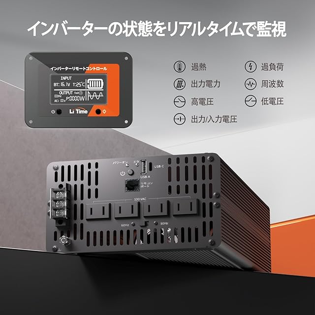 LiTime 12V 2000W 純正弦波 インバーター 正弦波4000W(瞬間出力)DC12V AC100V変換 4つのACコンセント 2つのUSB出力ポート 50Hz/60Hz周波数切替可能 リモートコントロール可能 カーインバーター キャンピングカー 車中泊 キャンプ 船 マリン キッチンカー アウトドア 太陽光発電 ハイブリッド 災害対策 地震 防災用品 停電の対策【日本語マニュアル付き】