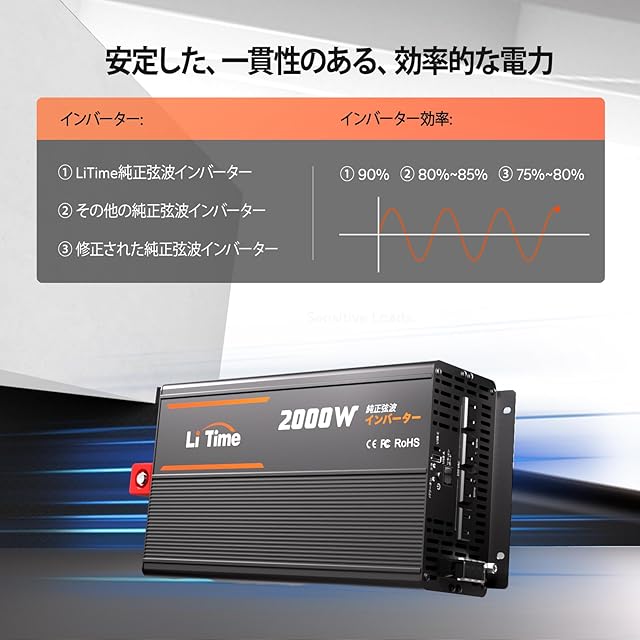 【2000W純正弦波インバーター】 LiTime 12V 2000W 純正弦波インバーターは12Vの直流電流を100Vの交流電流に変換できます。純正弦波インバーターで安定した低ノイズの電力出力を実現して、2000Wのパワーと4000Wのサージパワーでほとんどの家電製品を安定して長期間使用することができます。