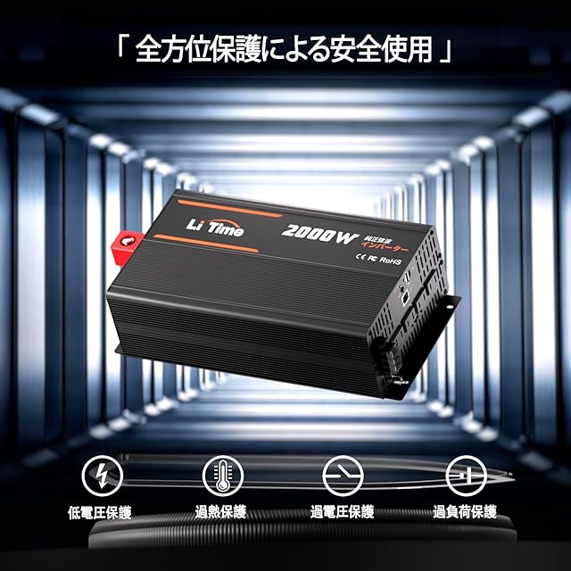 【多方面の安全保護機能】 LiTime 2000W純正弦波インバーターは、低電圧保護、過電圧保護、インバーター過熱防止、出力オーバーロード保護、出力短絡保護など、様々な保護機能を搭載しています。接続機器を全方位的に保護し、安心してお使いいただけます。多層的な安全設計により、安定した電力供給を実現します。LiTimeなら、安心のアウトドアライフをお約束します。