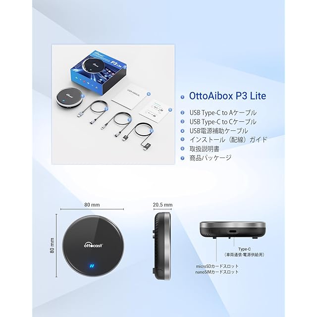 オットキャストp3ライト Ottocast OttoAibox P3 Lite 車でユーチューブを見る 新型carplay youtube再生アダプター カープレイaiボックス カープレイワイヤレス化 YouTube/Netflix/ABEMA/Disney+などを視聴可能 4+64GB Android 12搭載 有線式CarPlay搭載車用アンドロイド端末 技適取得済み製品