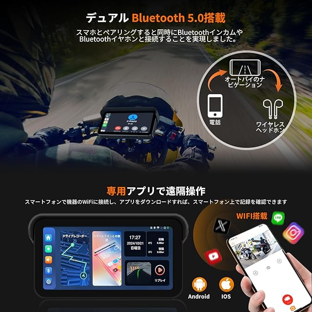 多種の携帯電話に完全対応、ワイヤレス操作が便利:バイク用ドライブレコーダーは、CarPlay/Android Auto/HiCARに対応し、Apple、Android、Huaweiの携帯電話に適用されます。iOS 10+、Android 11+、Huawei HiCAR版をサポートしています。バイクのCarPlayレコーダーには、ワイヤレスリモコン操作キーが搭載されており、ワイヤレスでディスプレイと接続されており、配線は不要です。リモコン操作で電話の応答/終了、CarPlay/Android Autoと画面の切り替え、写真撮影、ビデオロックなどが可能で、運転の利便性が向上します。