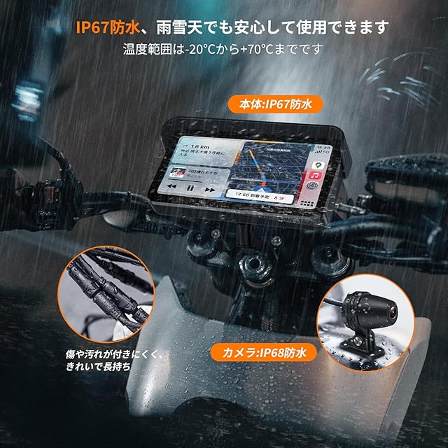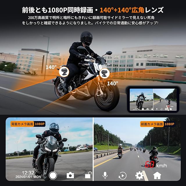 高解像度防水ディスプレイ、常時使用可能:バイク用ドライブレコーダーには、1560*700 IPS高解像度ディスプレイが搭載されており、輝度が1000nitに達し、前後1080Pデュアルカメラ録画が可能で、IP67防水に対応しています。晴れている日や雨の日でも、クリアな表示効果を維持し、ドライブ記録の正確性を確保します。