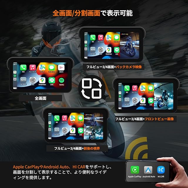 画面切り替えが柔軟で、高画質ディスプレイ搭載:バイク用スマートモニターには、6.25インチの大型高精細ディスプレイと1080Pの前後カメラが搭載されており、分割表示やフルスクリーン表示がサポートされています。フルスクリーンモードでは、CarPlay/Android Autoの画面を選択できます。分割表示モードでは、CarPlay/Android Auto+前方/後方/デュアルビューなど複数の画面を選択でき、さまざまな運転ニーズに対応します。
