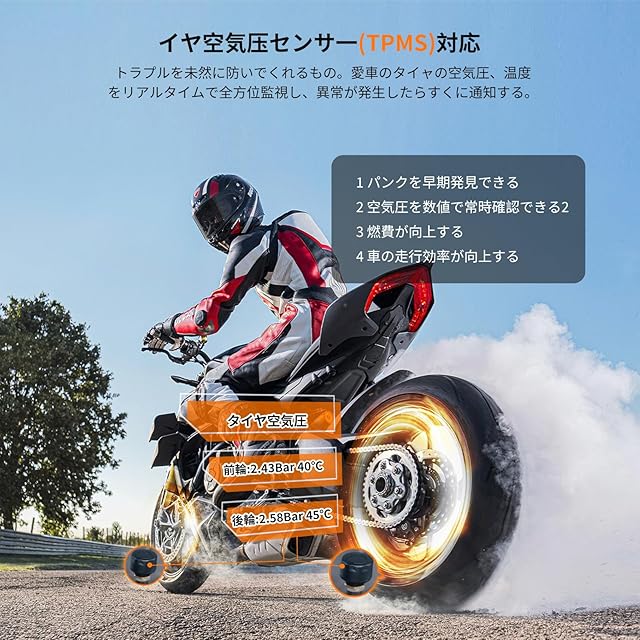 リアルタイムタイヤ圧モニタリング、より安全なドライブ:バイク用ドライブレコーダーは、タイヤの圧力値と温度をリアルタイムで監視し、警告タイヤ圧範囲を設定できます。設定値を上回ったり下回ったりすると、システムが自動的に警告を表示し、安全な運転を確保します。