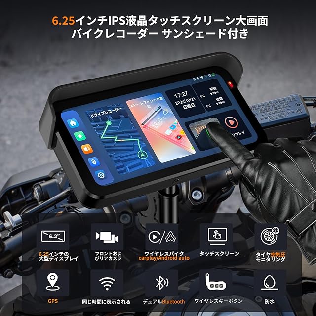 ATOVANKA 6.25 バイク用ドライブレコーダー Carplay、日よけつき、前後カメラ、前後タイヤ空気圧モニター、GPS位置情報システム、1080P+1080Pのデュアルスクリーン切り替え対応、自由録画可能、ループ録画対応、日本語取扱説明書付き、有線リモコン、64GB ストレージカード バイク用スマートモニターusb電源対応
