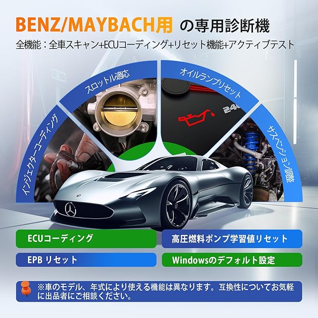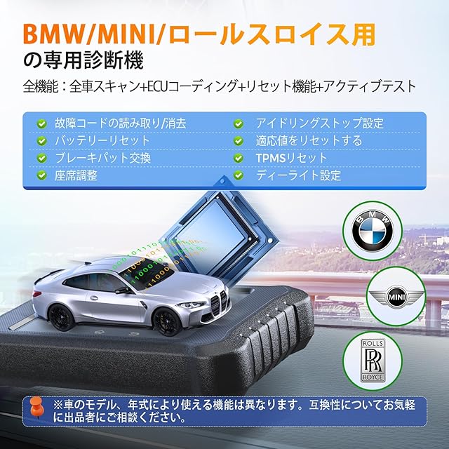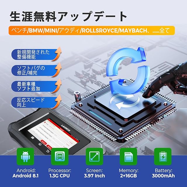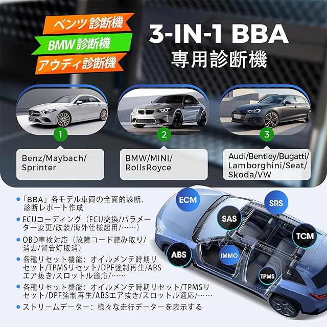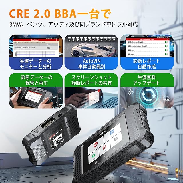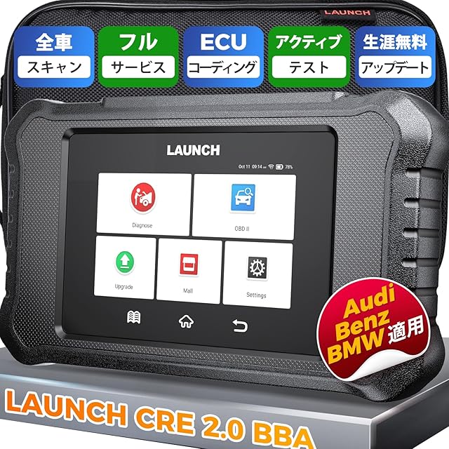 【 ベンツ/BMW/アウディ用のobd診断機】 LAUNCH Creader Elite 2.0 BBA は、BBA 車両 (ベンツ /マイバッハ /BMW /ミニ /ロールスロイス /アウディ) 向けの強力な故障診断機です。 日本で人気輸入車のBBAの3ブランドのほとんどのモデルに対応するLAUNCH CRE BBAは車両故障診断の故障コードの読み取り、消去、チェックランプのキャンセル、ECUコーディング、リセット、再学習、特殊機能、双方向制御、グラフィック ライブ データ、など車両の修理整備、日常メンテナンスに必要不可欠な諸機能をこの一台でフル対応します。すべてのBBA車両診断ソフトはダウンロード/アップデート生涯無料で、更新料金のある商品と比べて大金が節約できます。