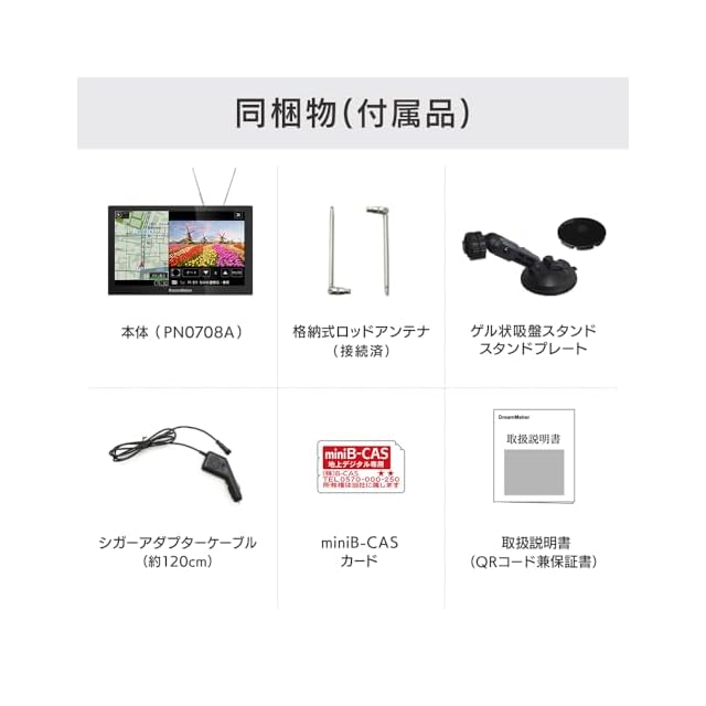 【さまざまな外部入出力】「バックカメラ入力端子」と「AV入力端子」を搭載。バックカメラとDVDプレーヤーなどのAV機器の同時接続が可能です。 ※本製品のバッテリー内蔵ではありませんので電源を取らずに使用することはできません。 【商品内容】 ・ポータブルナビゲーション本体 / ゲル状吸盤スタンド / シガーアダプターケーブル / スタンドプレート / miniB-CASカード / 格納式アンテナ(本体に接続しております)