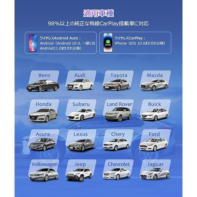 【多車種対応の柔軟性】DRIVIM CarPlay AI Boxは、特定の車種に限定された高価格な類似商品とは異なり、基本的にすべての純正有線Apple CarPlayに適合します。現在、600車種以上に取り付け可能で、純正有線CarPlay機能を搭載したメインユニットにも対応しています。適合情報は随時更新されておりますので、ご注文の際は装着車種をお知らせください。適合車種の例として、2016年以降のMercedes、Audi、Porsche、Volvo、VW、Ford、Peugeot、Citroën、Nissan、Honda、Toyota、Suzuki、Chevrolet、Land Rover、Lexus、Mazda、Jeep、または社外ナビのパイオニア(Pioneer)、ケンウッド(Kenwood)、アルパイン(Alpine)などがあります。ただし、「BMW」、「日産Leaf」、「日産Murano」、「日産GT-R」には対応しておりません。すべてのCarPlay搭載車両での使用を保証するものではないため、必ず車両の適合リストをご確認ください。適合に関して不明な点がある場合は、Amazonのチャットでお気軽にお問い合わせください。