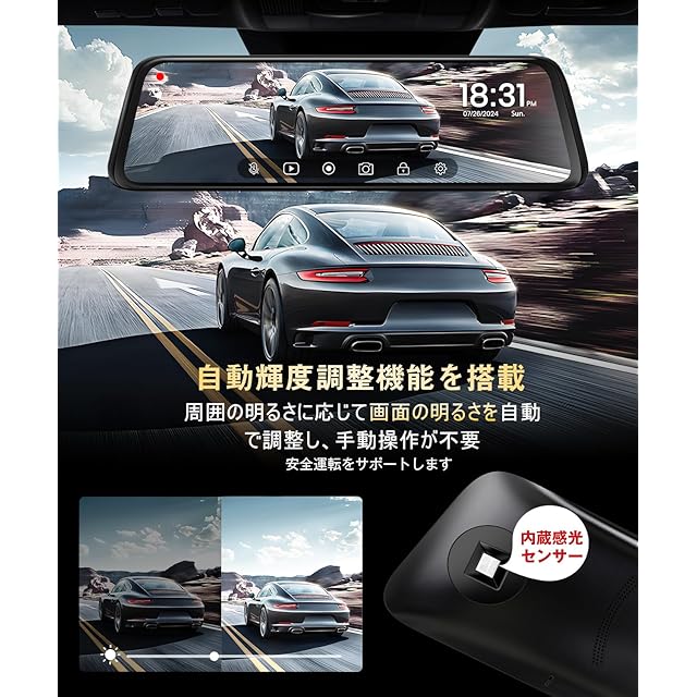 【自動輝度調節機能搭載】本ミラー型ドライブレコーダーには高精度な感光センサーを内蔵し、リアルタイムで車内の明暗環境を検知して液晶輝度を自動最適化します。運転中に手動操作を必要とせず、トンネル通過時や夜間走行時など急激な光環境変化にも即応し、暗所では輝度を自動低下させて眩しさを軽減し、明るいシーンでは過剰な反射を抑制して常にクリアな視界を確保します。快適性と安全性の両立を実現したこの機能で、幅広い運転状況下で安定した視認性を提供します。