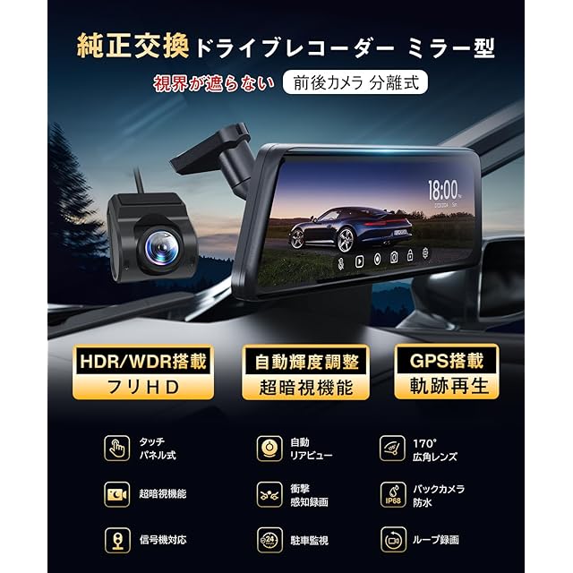 FOXPARK FT9 pro ドライブレコーダー ミラー型【最強 純正交換ミラー 95%車種対応】高画质分離式 前後カメラ 純正交換 デジタルインナーミラー 自動輝度調整・自動バック連動・超鮮明夜間暗視・HDR/WDR搭載 ドラレコ ミラー型 10インチ爆光液晶 Gセンサー タッチ式 GPS搭載 駐車監視 ループ録画 手動録画 衝撃検知 広角 IP68防水 日本語説明書【日本車対応】18ヶ月保証