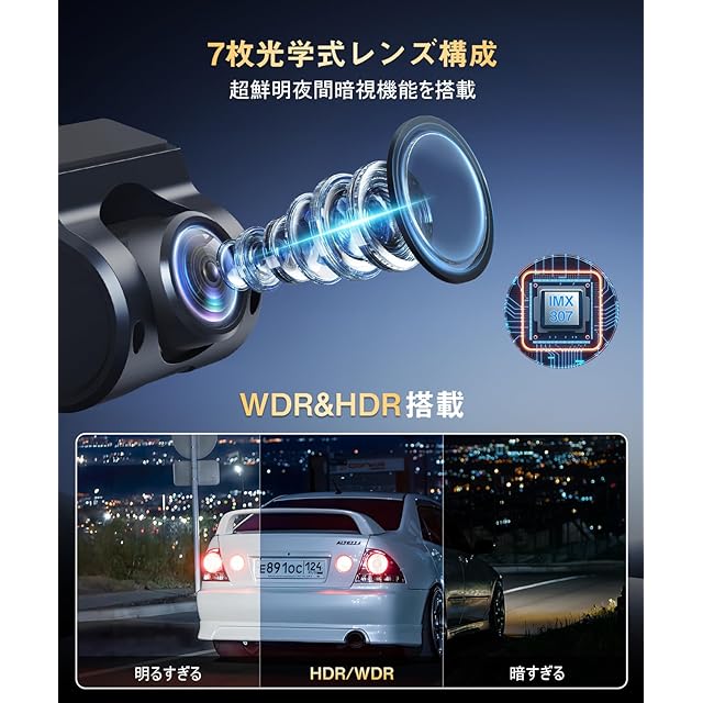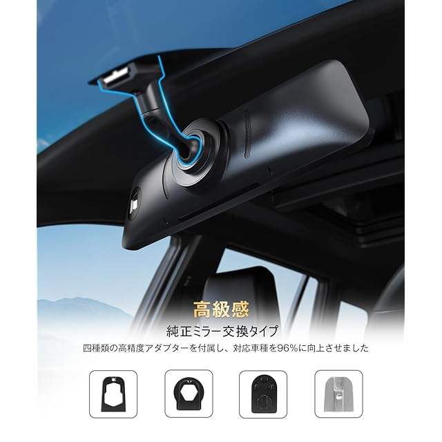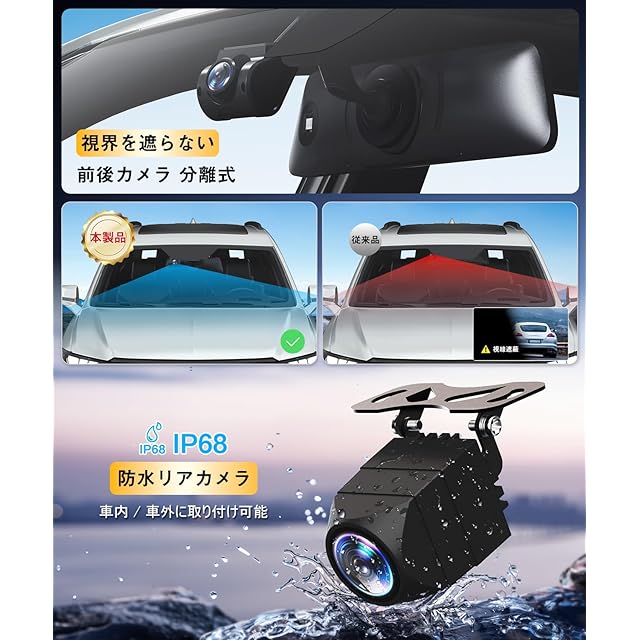 【高画质分離式前後カメラ設計 ドライブレコーダー ミラー型 分離】新開発高精細1080P(AHD)IPS液晶モニターを採用し、従来品より高品質な発色と広い視野角を両立します。前後カメラともに超鮮明夜間暗視搭載+HDR/WDR機能+業界トップクラス大口経F2.2レンズを採用で、特に夜間の白飛びや暗所つぶれを減らし、高画質を実現しています。裸眼よりも視認性が高いです。ミラー型ドラレコは、分離式カメラの設計により、ミラーの角度調整がカメラの映像に影響を与えません。フロントカメラはフロントガラスに取り付けが可能で、一体型ガラスの視野遮り問題を解消します。リアカメラは正像・鏡像の切り替えが可能で、前後方向に制約なく設置でき、柔軟性が大幅に向上。さらに、160度の広角リアカメラが約10インチの大画面に後方の映像を表示し、死角を3倍まで減少させ、安全性が飛躍的にアップします