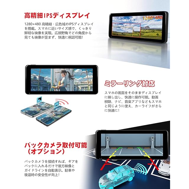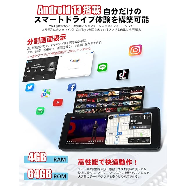 【コンパクト設計・車内スペースを取らず、視界も妨げない】コンパクトなデザインで、車内スペースを無駄にせず、スッキリと設置可能。運転中の視界を妨げることなく、安全な運転をサポートします。車内を広く使いながら、邪魔にならない設計で、快適なドライブを提供します。【2画面同時表示・効率的なマルチタスク操作】2画面同時表示機能で、複数のアプリを一度に表示・操作可能。ルート確認しながら音楽操作、動画を流しながら天気チェックなど、用途に合わせて自由に活用でき、より快適でスマートなドライブを実現。