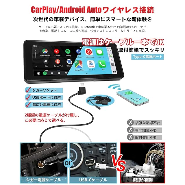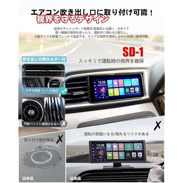 【取付簡単・電源ケーブルが1本で完了】取付けが簡単で、電源ケーブル1本だけで使用開始できます。面倒な配線作業は不要で、すぐにご使用いただけます。シンプルで使いやすい設計なので、誰でも手軽にセットアップ可能。時間を節約し、ストレスフリーな導入が可能です。さらに、シガーソケット用やUSBポート用2種類の電源ケーブルが付属し、ご必要に応じて選べます。【エアコン吹き出し口に取付・安定した固定で倒れる心配なし】エアコンの吹き出し口に簡単に取り付け可能で、クリアな視界を確保しながら使用できます。専用ホルダーでしっかりと固定され、運転中に倒れる心配もありません。シンプルで安定した取り付けが可能で、安全かつ快適にお使いいただけます。