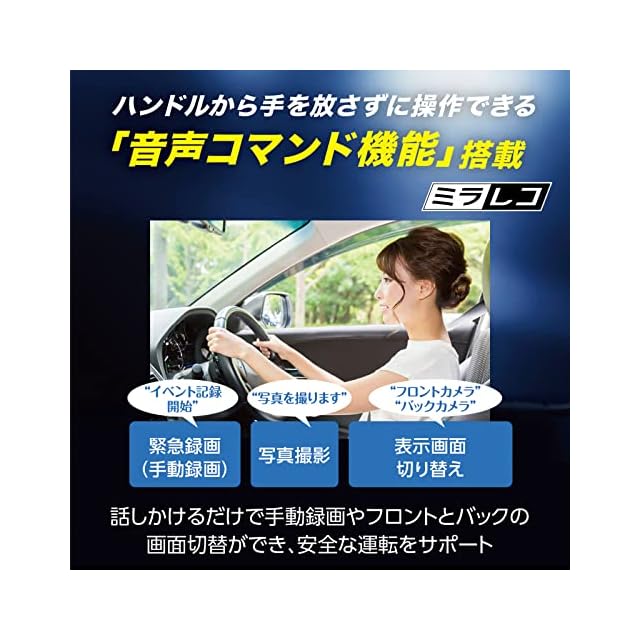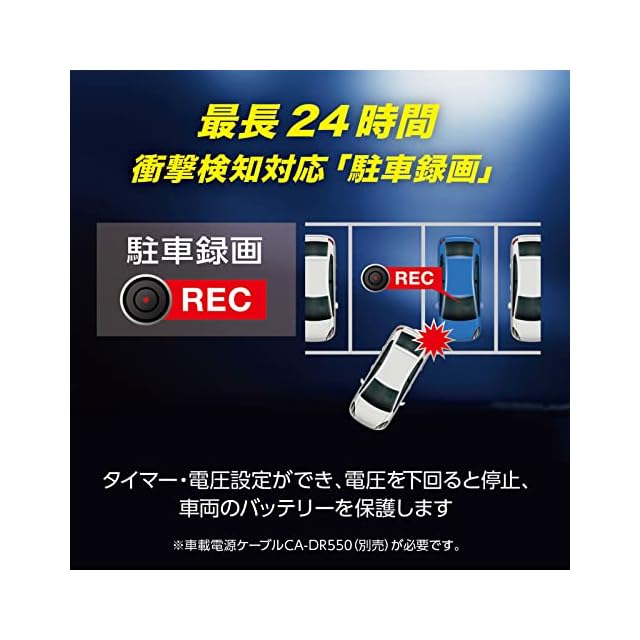 幅広い車種に装着可能なバンド式装着・SDカードメンテナンスフリー・前後カメラにWDR搭載・Windows/Mac対応専用PCビューアソフト・スーパーキャパシター搭載・車載電源ケーブルCA-DR550(別売)使用で、最長24時間衝撃検知の駐車録画可能。