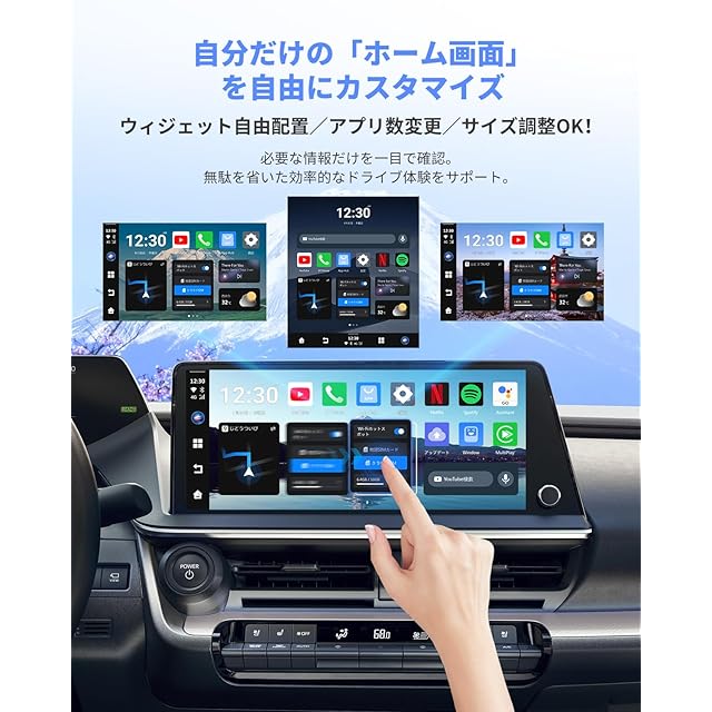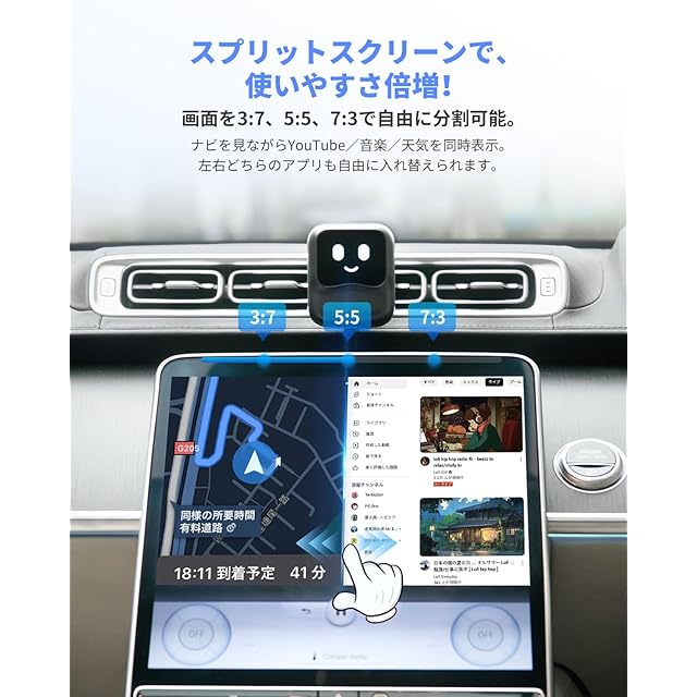 【豊富なアプリ対応&スプリットスクリーン機能】 お好みのアプリを自由にダウンロードいただけるため、動画(YouTube、Netflixなど)、カーナビ(Googleマップ、Yahoo!カーナビなど)、音楽(Amazon Music、YouTube Musicなど)など、さまざまなアプリをお楽しみいただけます。また、スプリットスクリーン機能も搭載しており、ナビゲーション中でも動画を同時にお楽しみいただけます。画面分割比は3:7、5:5、または7:3から選ぶことができ、左右のアプリを自在に切り替えることも可能です。