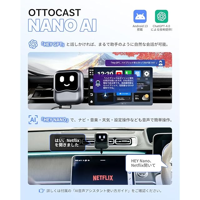 オットキャスト 公式 OTTOCAST OttoAibox Nano 2025 新型 CarPlay&AndroidAutoをワイヤレス化 android 13.0モデル ワイヤレス CarPlay Android Auto両対応 ChatGPT4.0 Nano ai box AI音声搭載 Youtube Netflix など動画視聴可能