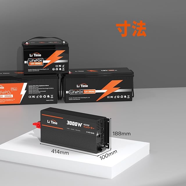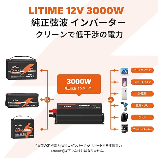 【3000W純正弦波インバーター】 LiTime 12V 3000W 純正弦波インバーターは12Vの直流電流を100Vの交流電流に変換できます。純正弦波インバーターで安定した低ノイズの電力出力を実現して、3000Wのパワーと6000Wのサージパワーでほとんどの家電製品を安定して長期間使用することができます。