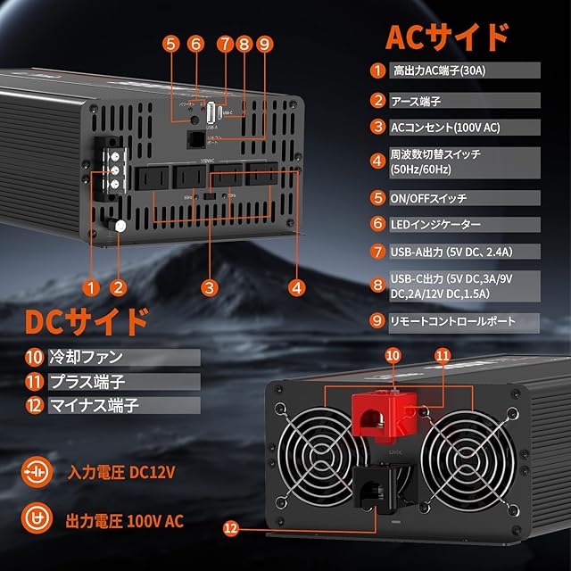 【多様な出力ポートで便利に使用可能】 LiTime 3000W正弦波インバーターは、4つの100V ACコンセント、USB‐AとUSB-C出力ポートがあり、多様な出力ポートで様々な使用需要を満たします。スイッチにより、50Hz/60Hz周波数切替可能で、異なる地域でも活用できます。