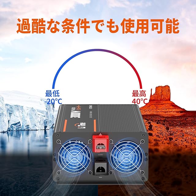 【過酷な環境下での幅広い使用】 LiTime 12V3000W インバーターは2つの冷却ファンにより、-20°Cから40°Cの広い温度範囲で正常に動作します。使用環境に制限が少なく、キャンプ、車中泊、マリン、オフグリッド太陽光システムなど、様々なシーンで活用できます。過酷な環境下でも安定した電力供給が可能です。アウトドアや移動中でも、快適な電力環境を実現します。