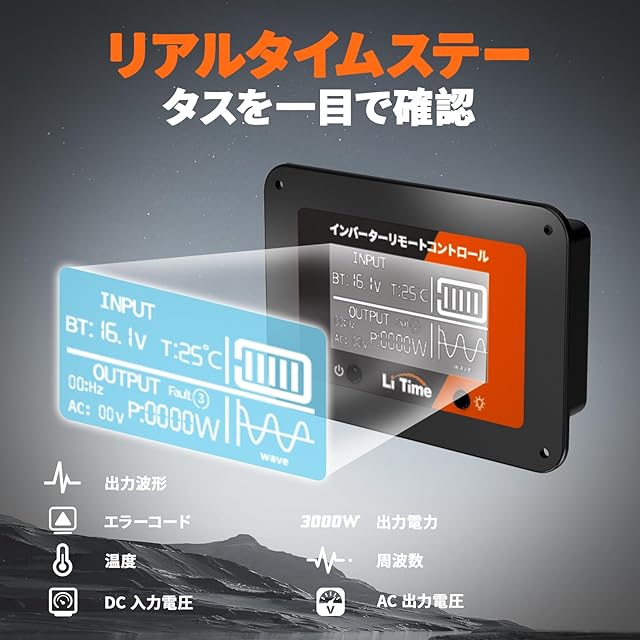 【便利なリモート管理を実現】LiTime 12V3000W 正弦波インバーターは、リモートコントロールモジュールが付いています。リモコンモジュールのLCDスクリーンではDC入力電圧、バッテリー残量、周波数、AC出力電圧、出力電力等の情報を表示して、ボタンでインバーターをオン/オフすることも可能で、状況を素早く把握できるため、万が一のトラブル時にも迅速な対応ができます。