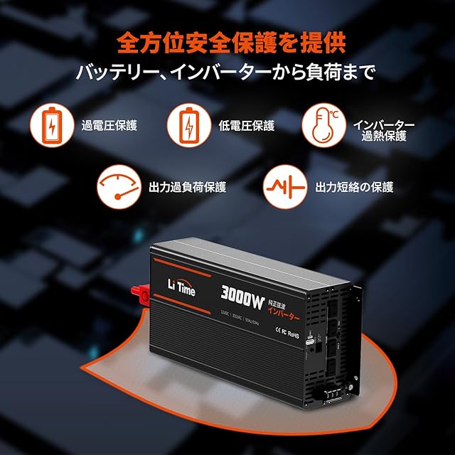【多方面の安全保護機能】 LiTime 3000W純正弦波インバーターは、低電圧保護、過電圧保護、インバーター過熱防止、出力オーバーロード保護、出力短絡保護など、様々な保護機能を搭載しています。接続機器を全方位的に保護し、安心してお使いいただけます。多層的な安全設計により、安定した電力供給を実現します。LiTimeなら、安心のアウトドアライフをお約束します。