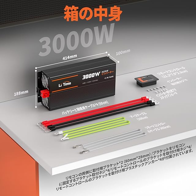 【付属品&アフターサービス】 LiTime 12V 3000W DC-AC変換 インバーターには、本体に加えて設置・接続に必要なケーブル類などの標準付属品が同梱されています。お手元に届きましたら、すぐに使用開始できます。また、2年間のメーカー保証が付いています。お困りの点があれば迅速かつ丁寧に対応させていただきます。わかりやすい日本語の取扱説明書も付属しているので、初心者の方でも安心してお使いいただけます。