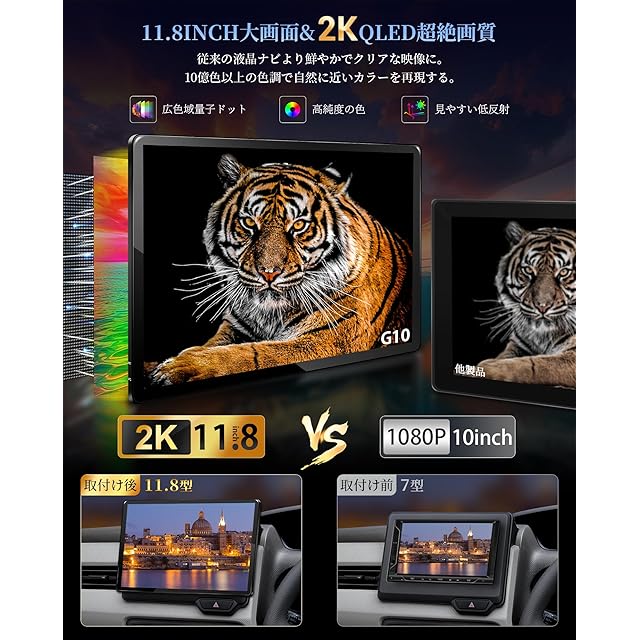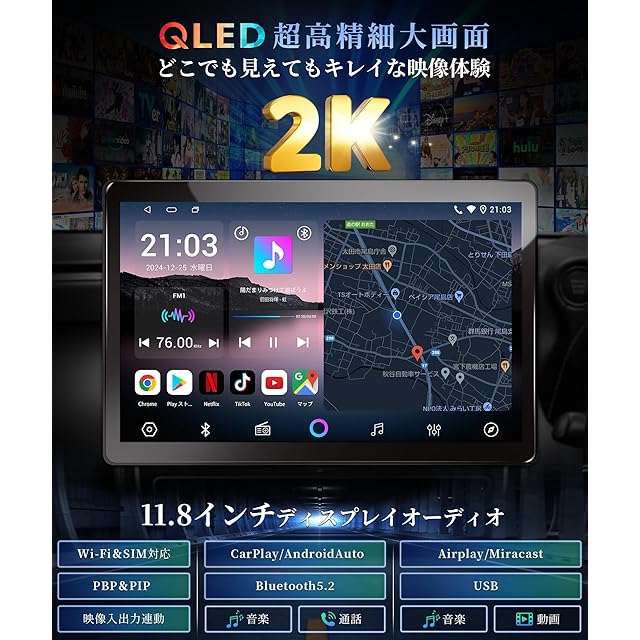 ●【2025年新登場 11.8インチ 1DIN ディスプレイオーディオ:大画面化が止まらない】2024年の11.8型カーナビ「PR106」を発売以来、見やすく迫力があり、ビジュアル的にも先進のイメージを与えられたりと魅力いっぱいの大画面のユニットだが、従来サイズのナビやディスプレイ部を大型化したいと思っているユーザーも多くなりました。●【2K QLED大画面液晶採用:高精細な画質を楽しめる】量子ドット技術によるQLED ディスプレイオーディオ 2K高画質ネイティブ解像度は(2000×1,600)とFHDに比べ、よりきめ細かい繊細な高画質映像をお楽しみいただけます!