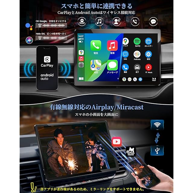 ●【ワイヤレスCarPlay/Android Auto接続:利便性向上】無線 アンドロイドカープレイ接続は、iPhone/AndroidスマホをUSBケーブルで接続する必要がなく、車に乗り込むだけで自動的に接続されます。ワイヤレス接続対応ナビ、ケーブルの煩わしさから解放されます。ワイヤレス接続を利用することで、音楽やナビゲーションアプリをスムーズに操作でき、ハンズフリー通話も可能です。これにより、安全運転を維持しながらスマートフォンの機能を活用できます。●【有線および無線AirPlay/Mircast接続対応】 スマートフォンの画面をカーナビに映し出すことで、ナビゲーションアプリや音楽アプリを大画面で利用できます。AndroidおよびiOSデバイスと互換性があり、さまざまなスマートフォンからミラーリングが可能です。★一部アプリが著作権あるのため、ミラ―リング機能を非対応です。
