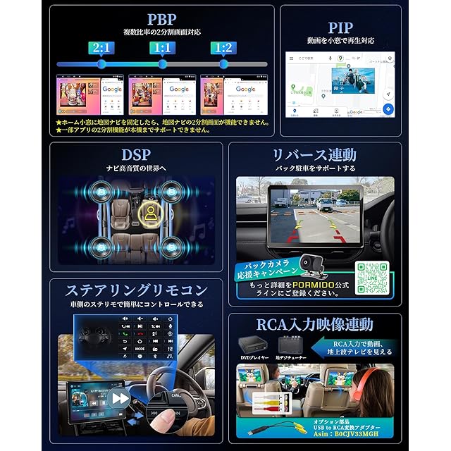 ●【Bluetooth 5.2を搭載した高音質 カーナビ】カーオーディオ Bluetooth 5.2は、最新の音声コーデックに対応しており、より高音質な音楽再生が可能です。特に、LDACやAACなどの高音質コーデックをサポートすることで、圧縮された音源でもクリアで豊かなサウンドを楽しむことができます。さらに、音楽再生中の途切れや遅延が少なく、快適なリスニング体験が提供されます。●【多比率の2分割画面&PIP機能対応】カーナビ 大画面ナビ 2画面同時表示:2つのアプリを同時に表示させて画面の分割比率は「1:1」、「1:2」、「2:1」の選択が可能です。*ホーム小窓に地図ナビを固定したら、その地図ナビを2分割画面機能が非対応。 PIP機能:USB動画再生する時、動画をほかのアプリケーションを同時表示。●【AM/FMラジオ放送対応】:76MHz〜108MHzのワイドチャネルの放送対応 カーオーディオ ディスプレイ!●【USB接続 カーオーディオ:オフラインでも音楽や動画も対応】本機まで最大の256Gb外部USBメモリを接続可能、自分の好きな音楽を簡単に持ち運ぶことができます。