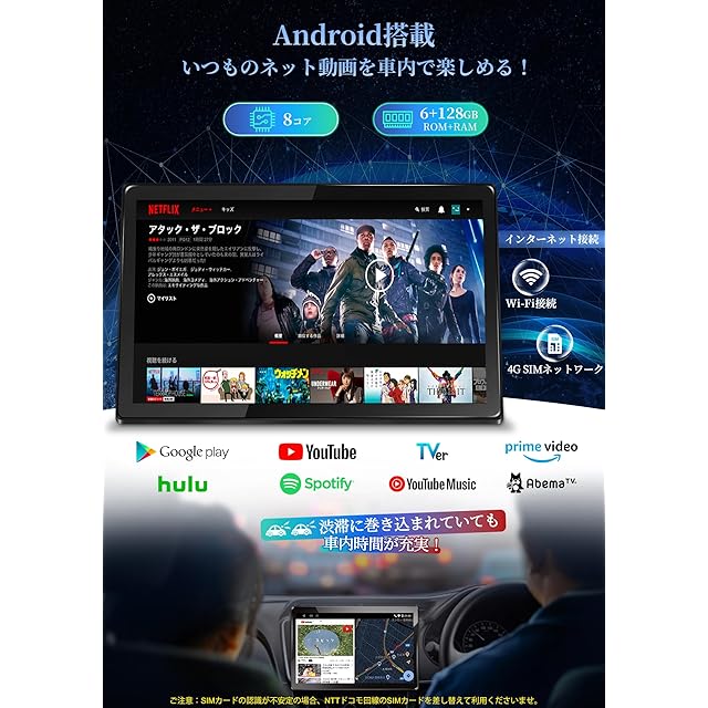 ●【車内でのAndroid革命:高性能8コアCPU、6+128GB大容量】アンドロイド カーナビこの1台でみんなクルマに、お好きなネット動画を観える、お好きなネット音楽も聴こえます。8コアプロセッサにより、複数のアプリケーションを同時にスムーズに動作させることができます。128GBのストレージは、地図データや音楽、動画などをたっぷり保存することが可能です。特に地図データは頻繁に更新されるため、大容量のストレージは非常に便利です。●【Wi-Fi/4G SIMカードネット接続で車内時間を充実する】車載ポケットWi-Fi、携帯デザリング、4GのSIMカードでインタネットを繋げます。ネットで最新のマップデータ、最新の動画情報などandroid ディスプレイオーディオから実現できます。