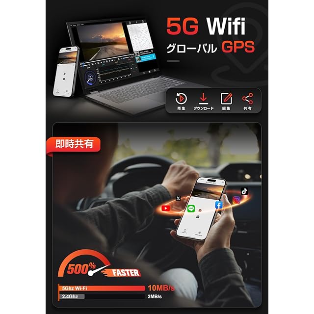 【Wi-Fi & GPS機能によるスマート連携】 スマホとWi-Fiで簡単に連携し、リアルタイムで記録映像を確認したり、SNSでシェアしたりできます。専用アプリを使って、車両周囲の状況をリアルタイムで監視することも可能です。また、内蔵GPSにより走行距離、速度、位置情報を正確に記録し、ドライブの思い出だけでなく、事故の証拠としても活用できます。