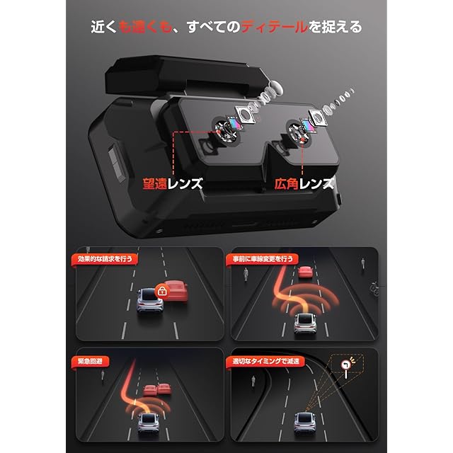 【広角と望遠のダブルレンズで、遠近全方位をカバー】 広角レンズと望遠レンズを組み合わせ、前方135°の広範囲をカバーする一方、遠方のナンバープレートや標識など、重要な情報を詳細に記録します。視野を広く、かつ遠方まで鮮明に捉えることで、死角をなくし、長距離運転や高速走行中の安全性を確保します。これにより、ドライバーは前もって状況を把握し、素早い判断を下せます。