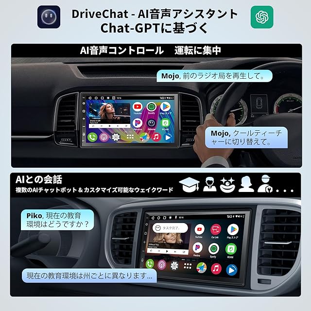 DriveChat、Siri、Google: AI音声アシスタント:一般的なAndroidカーオーディオとは異なり、A6 PLはSiriやGoogleアシスタントに加え、ChatGPTを基にした独自開発のDriveChatも搭載しています。これにより、新しいAI音声アシスタントの選択肢が増え、ナビゲーションや音楽などの音声コマンドでカーオーディオを操作することが可能です。DriveChatは、さまざまなチャットボットとカスタマイズ可能なウェイクワードを。