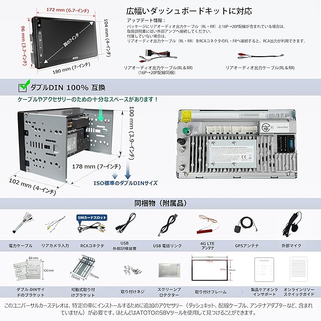 高い互換性とカスタマーケア:ダブルDIN仕様のA6 PLは、さまざまなダッシュキットに対応する172×96mmのフロントパネルと7インチのタッチスクリーンを備えています。ビデオ出力やUSB TPMSなどの追加機能にも対応。商品ヘルプデスク:購入日から12ヶげつ間の製品ケアをご利用いただけます。条件を満たすことで、さらに6ヶげつの追加サポートをご提供いたします。詳細は製品パッケージ中の説明書でご確認ください。
