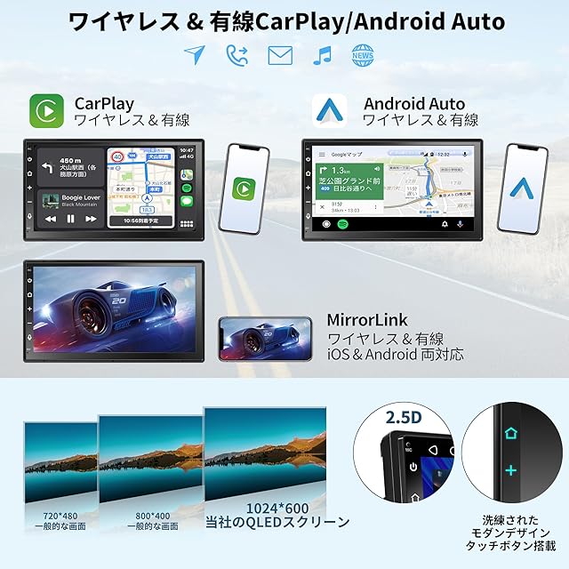 ワイヤレスCarPlay/Android Auto、MirrorLink:標準のワイヤレスCarPlayおよびAndroid Autoにより、運転がより効率的になります。一度BT/Wi-Fiの設定を行えば、車に乗り込むとCarPlay/Android Autoが自動的に接続され、ケーブルは不要です。オンラインマップ(CarPlay/Android Auto経由)やオフラインナビゲーション用の内蔵GPSにも対応しています。さらに、CarbitLinkを使ってアプリをスクリーンにミラーリングすることも可能。