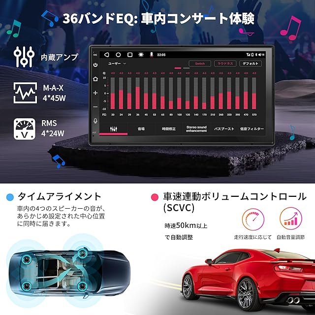 コンサート品質のサウンドを実現するDSP & EQ:高度なDSP機能により、タイムアライメントなどの技術で音が最適なタイミングで届きます。SCVC(車速連動ボリュームコントロール)は、オーディオの音量を走行速度に応じて自動調節可能、ビートを逃しません。さらに、36バンドの調整可能なEQにより、個別のサウンドチューニングが可能です。内蔵のM-A-X 4×45Wおよび4×24W RMSアンプ、調整可能なクロスオーバーを組み合わせることで、より豊かで没入感のある音楽体験を。