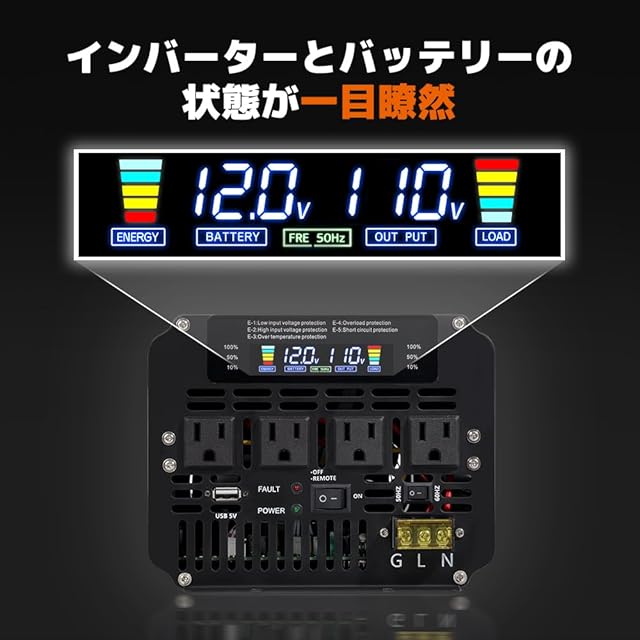 【スマート保護機能】自社開発のチップを使用し、インバータの運転状況をリアルタイムで監視し、過電圧保護、低電圧保護、過電流保護、過熱保護、出力短絡保護を実現できます。